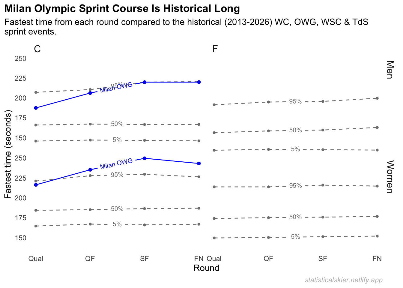 The following plot shows how the Milan Olympic course stacks up against the distribution of times across all other classic sprints. The 5%, 50% & 95% lines indicate the 5th, 50th (median) and 95% percentile times across all races in that panel.