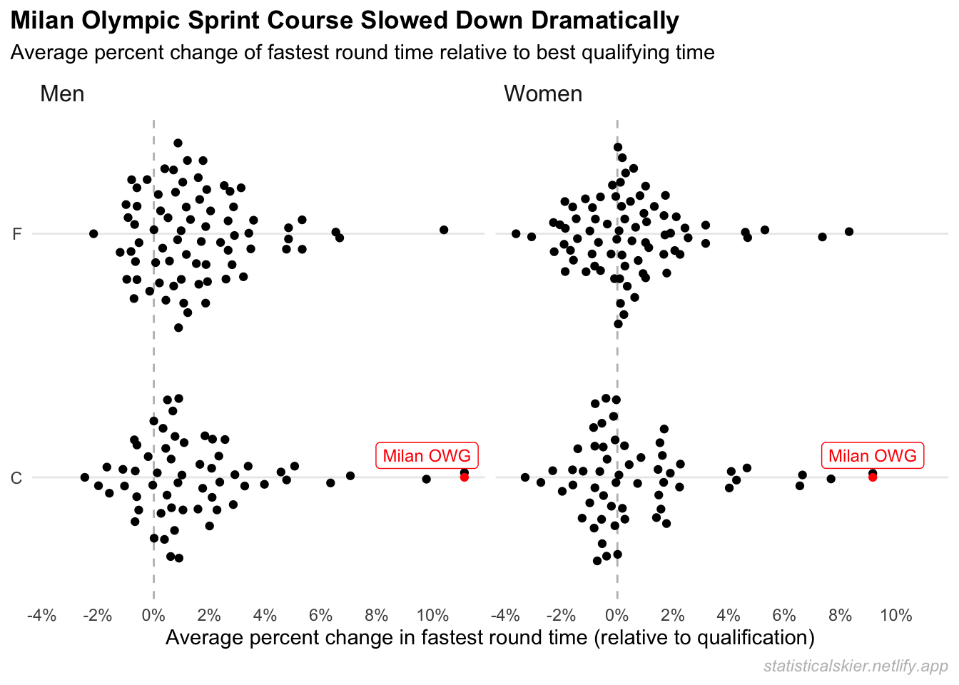 The following plot shows the distribution of the average percent change relative to the fastest qualification time across all sprint races since 2013. Once again, this Milan Olympic course slowed down during the day by an historic amount.